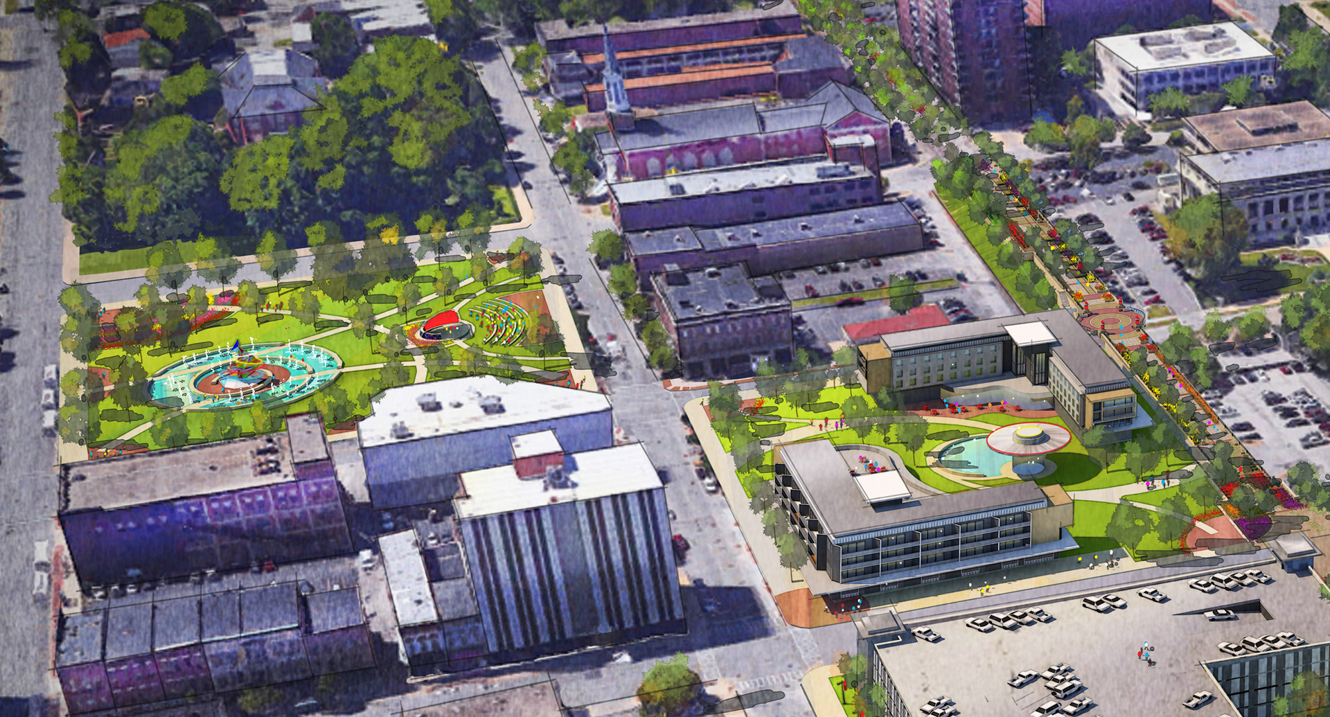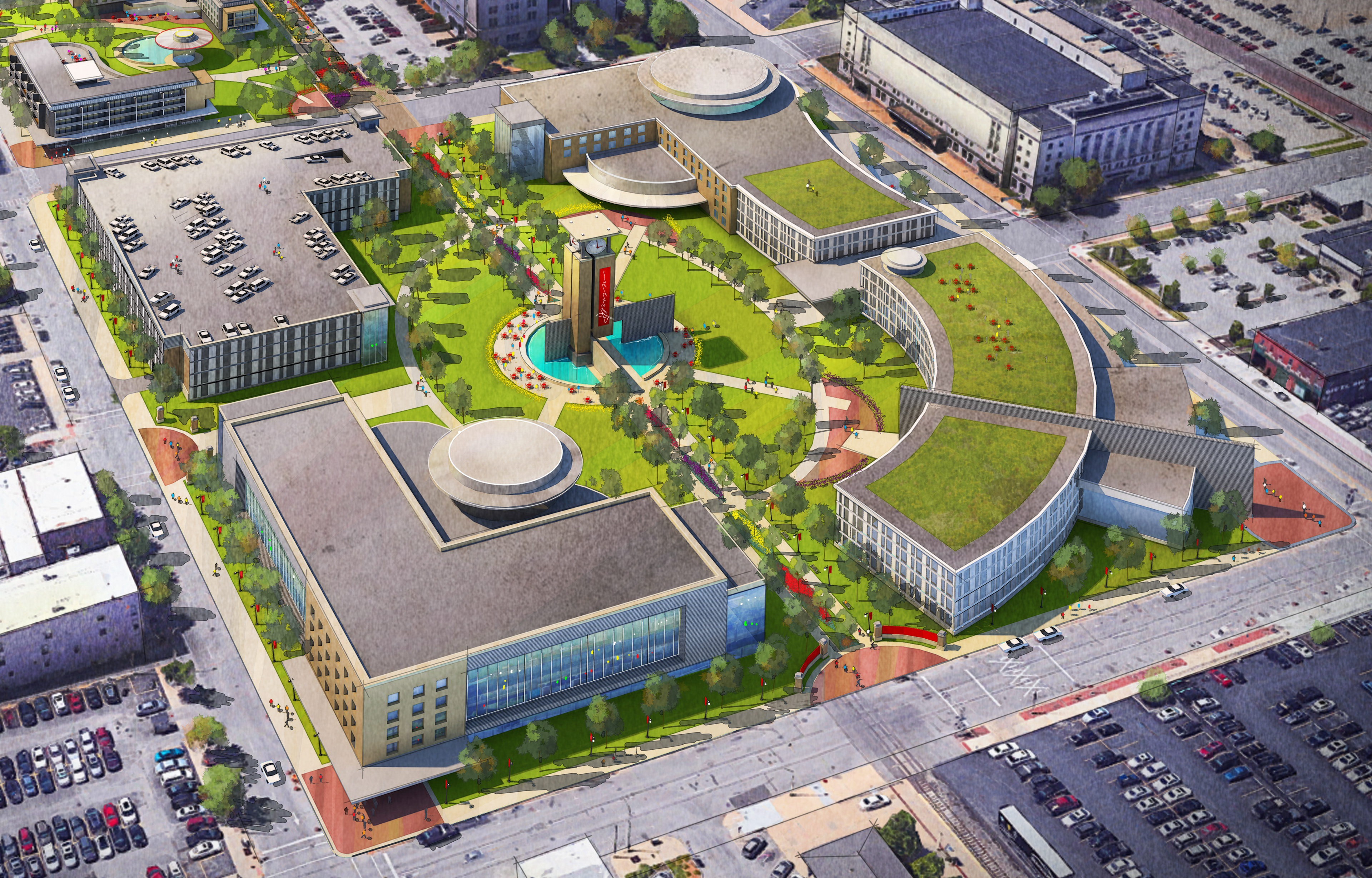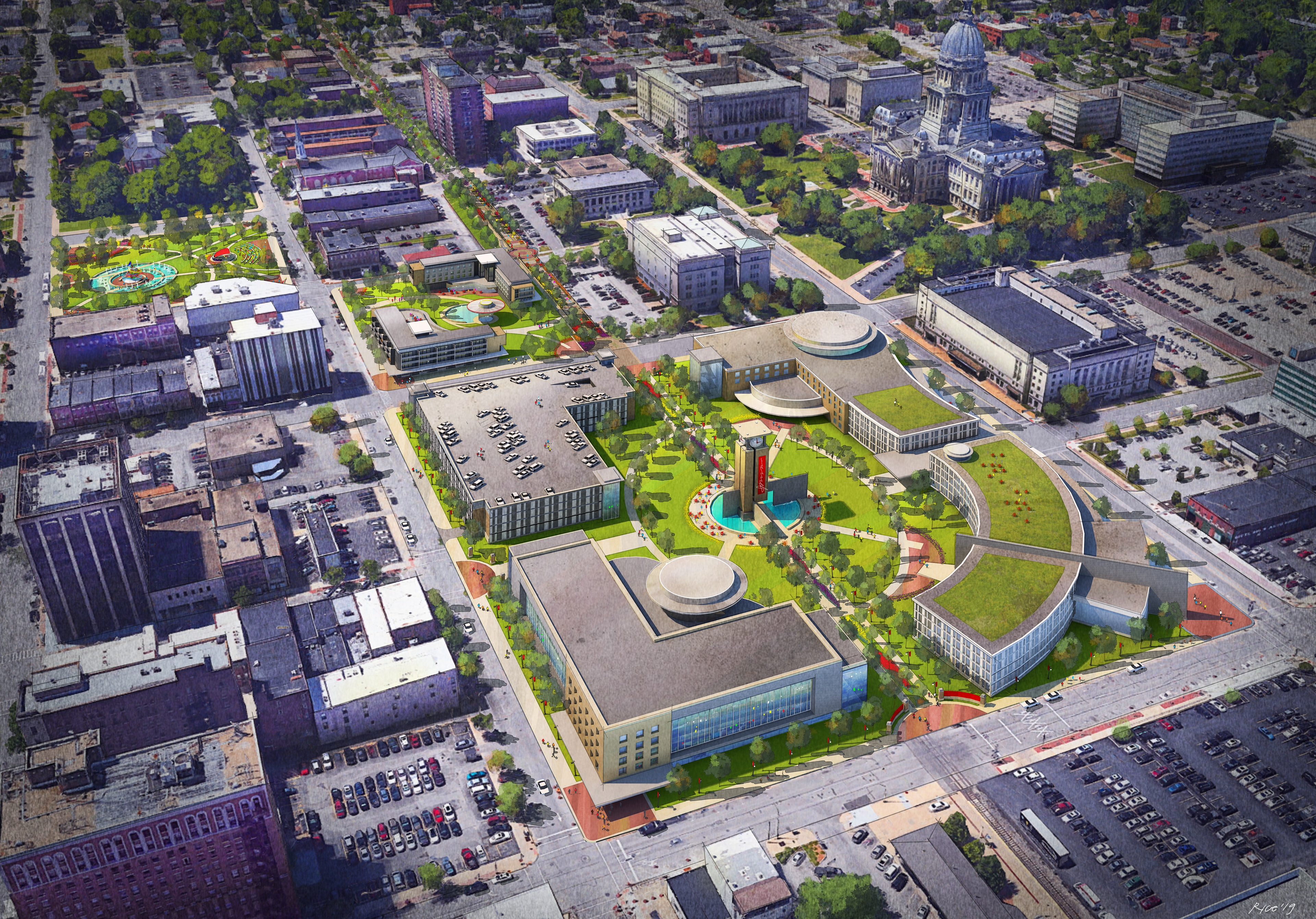 Marketing graphic for a proposed college campus in the heart of a Midwestern city. I was given the freedom to invent the architecture, as well as, the site plan, and landscape. Work flow: Sketchup model, Cinema 4d render, Photoshop.