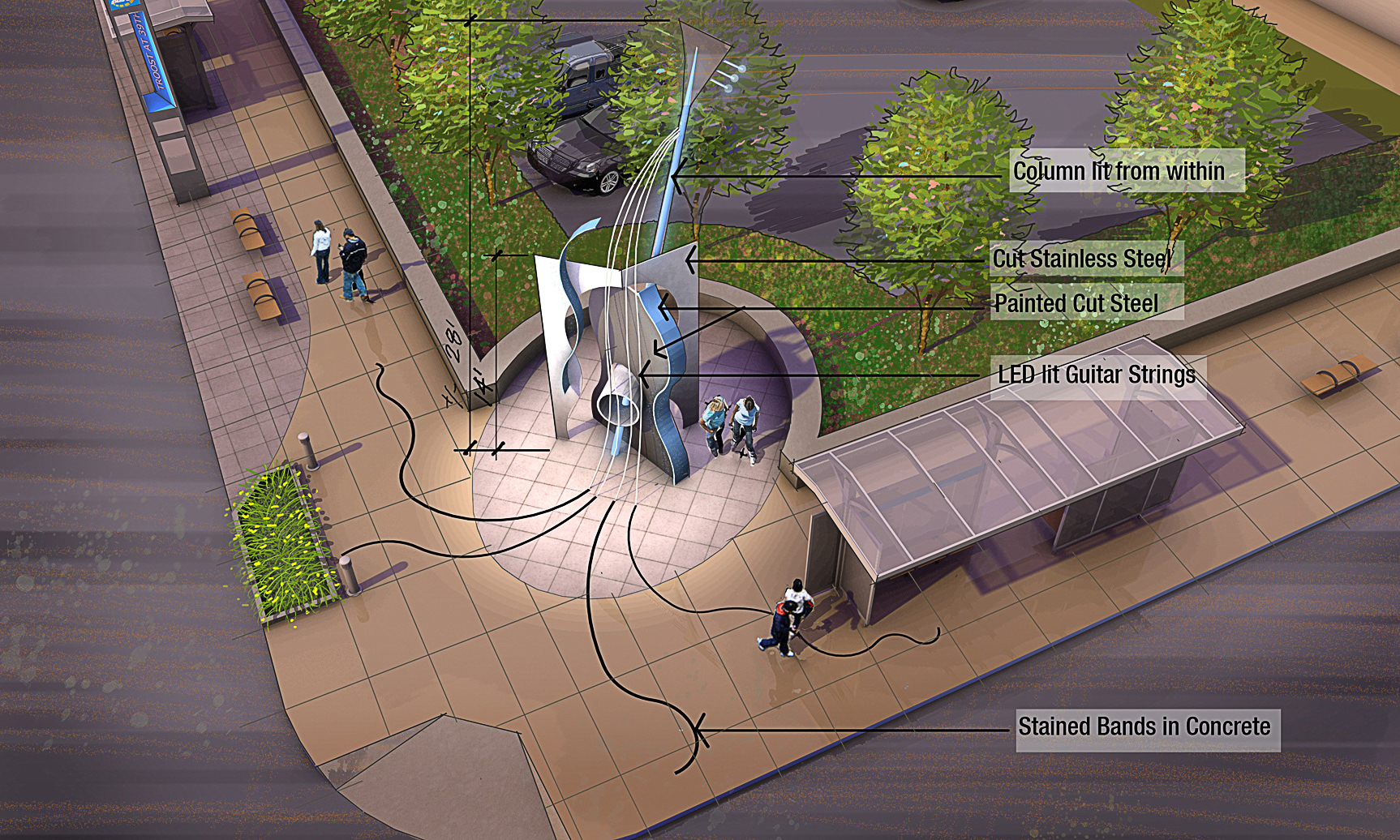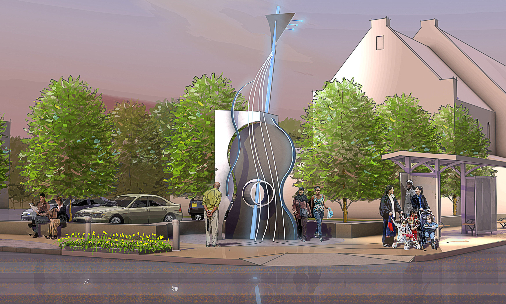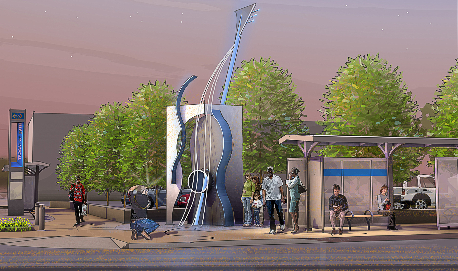 Images created for a public art proposal along Troost Avenue in Kansas City, MO. Workflow: Sketch Up model, rendered in Cinema 4D, and lots of post render in Photoshop. Artist: Travis Rice Studio and RDG Art Studio.