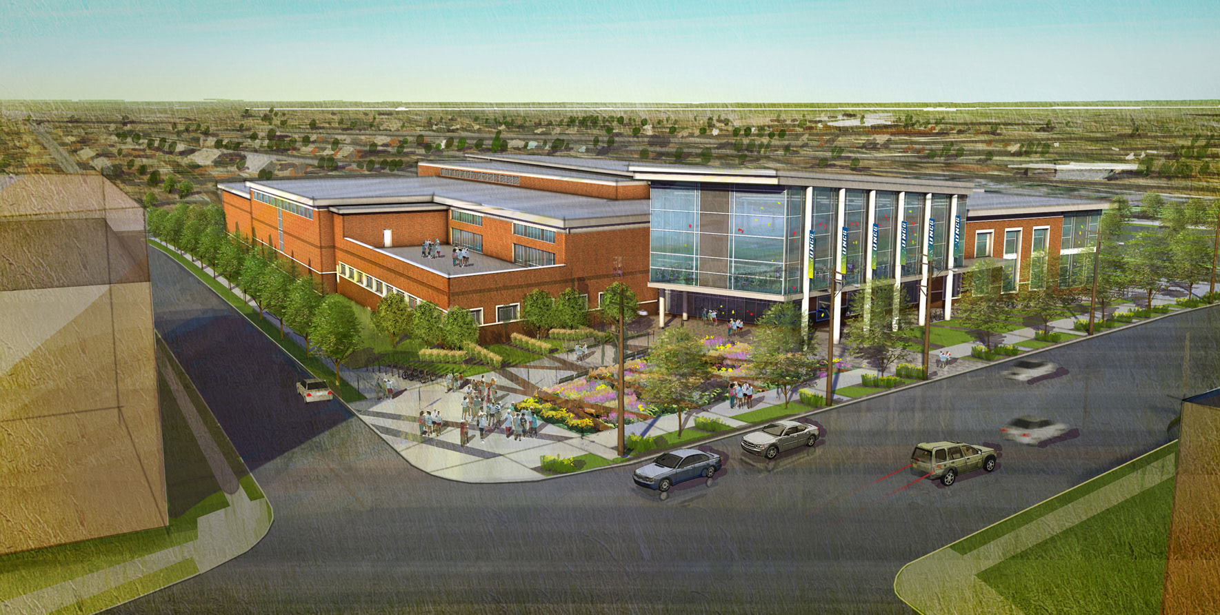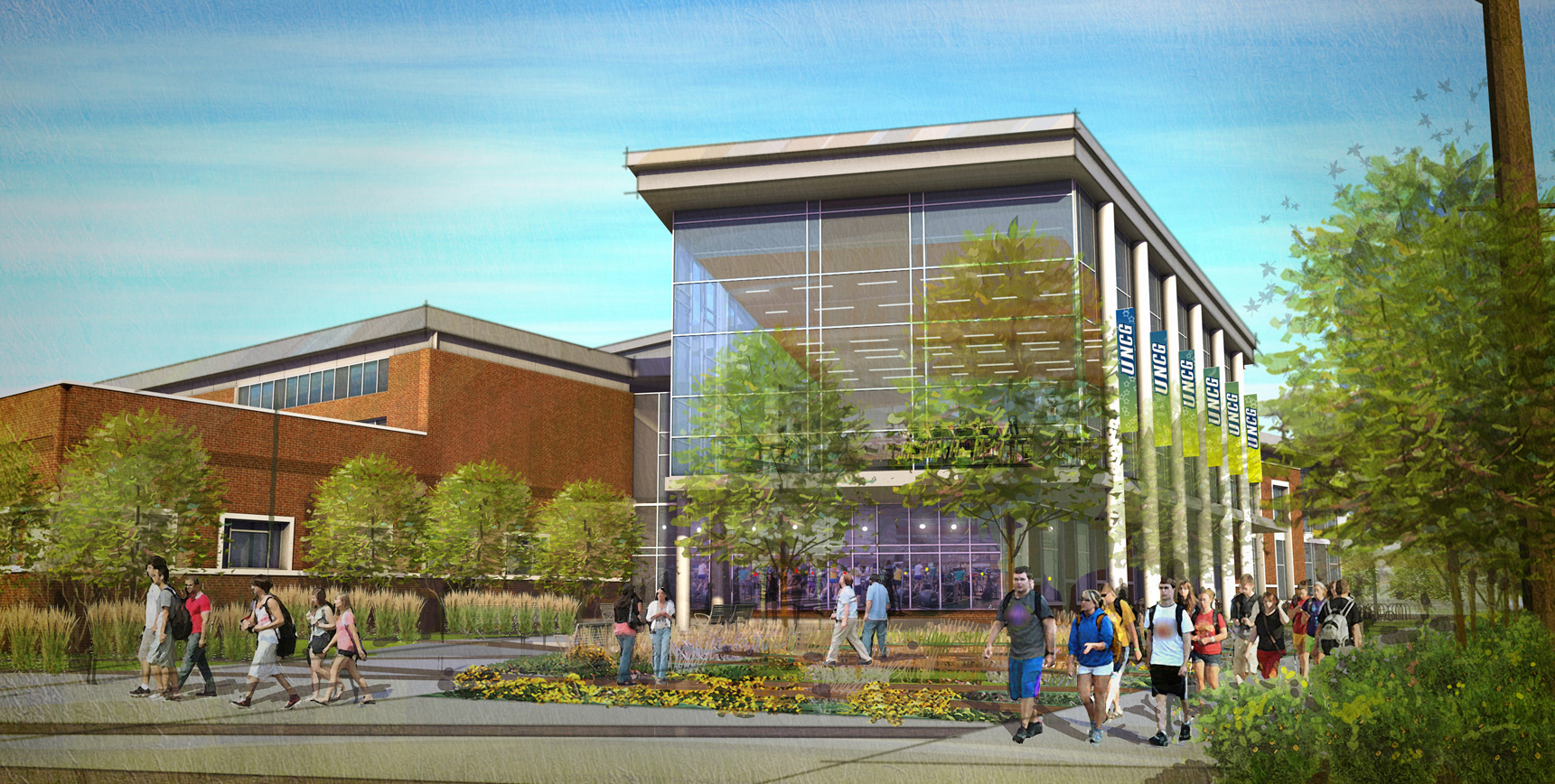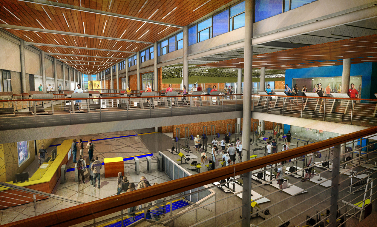 Proposed Recreation Center for the University of North Carolina at Greensboro, Greensboro, NC. Workflow: Revit model exported as dwg., brought into Sketch Up, rendered in Cinema 4D, post render in Photoshop. Architecture by RDG Planning and Design.